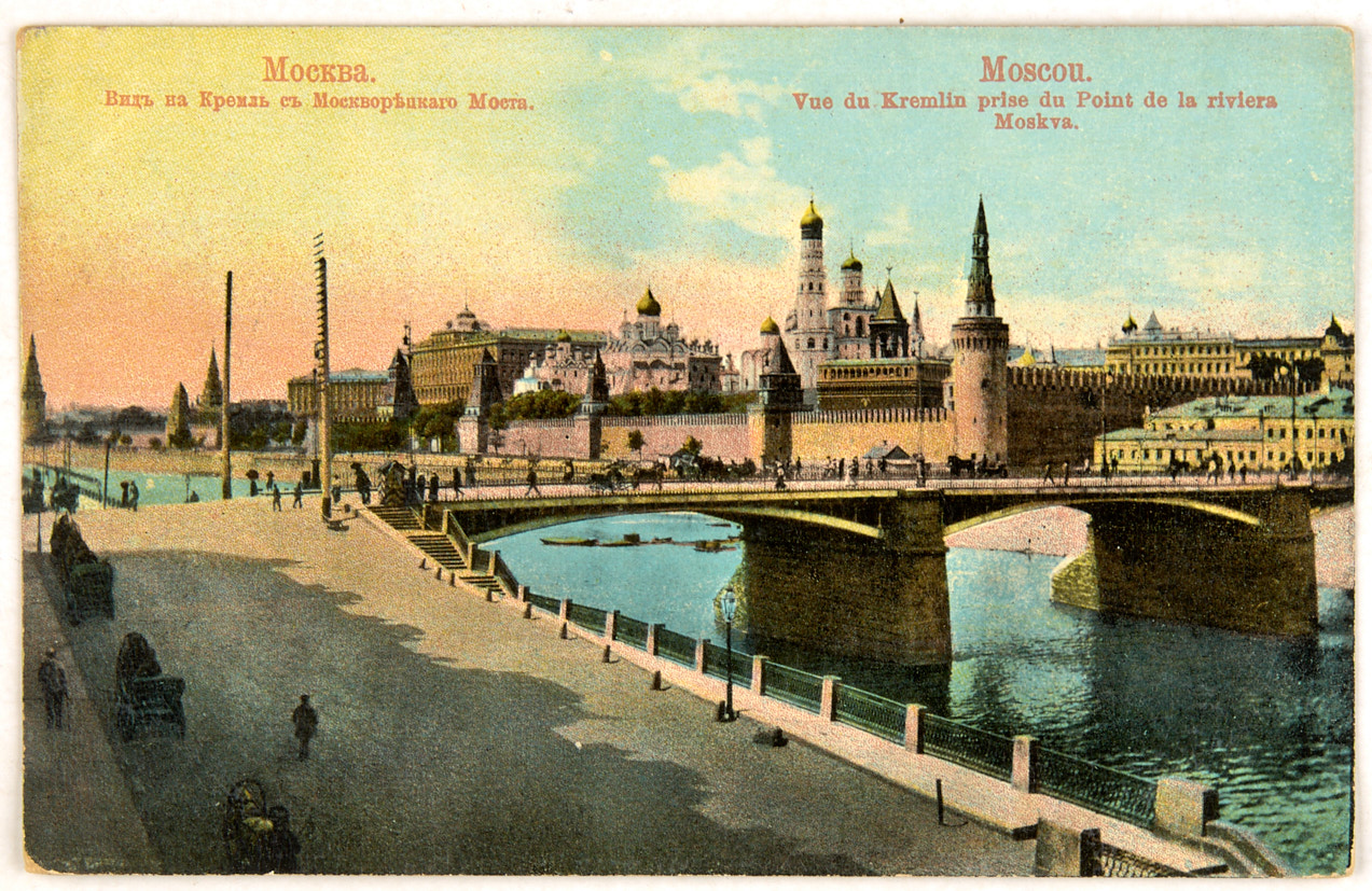 Лот из двух цветных видов Москвы: вид Кремля с Москворецкого моста, Красная площадь. Начало ХХ в. Всемирный почтовый союз. Издание тов-во А. Абрикосова, Гранберг. Москва. 14×9 см.