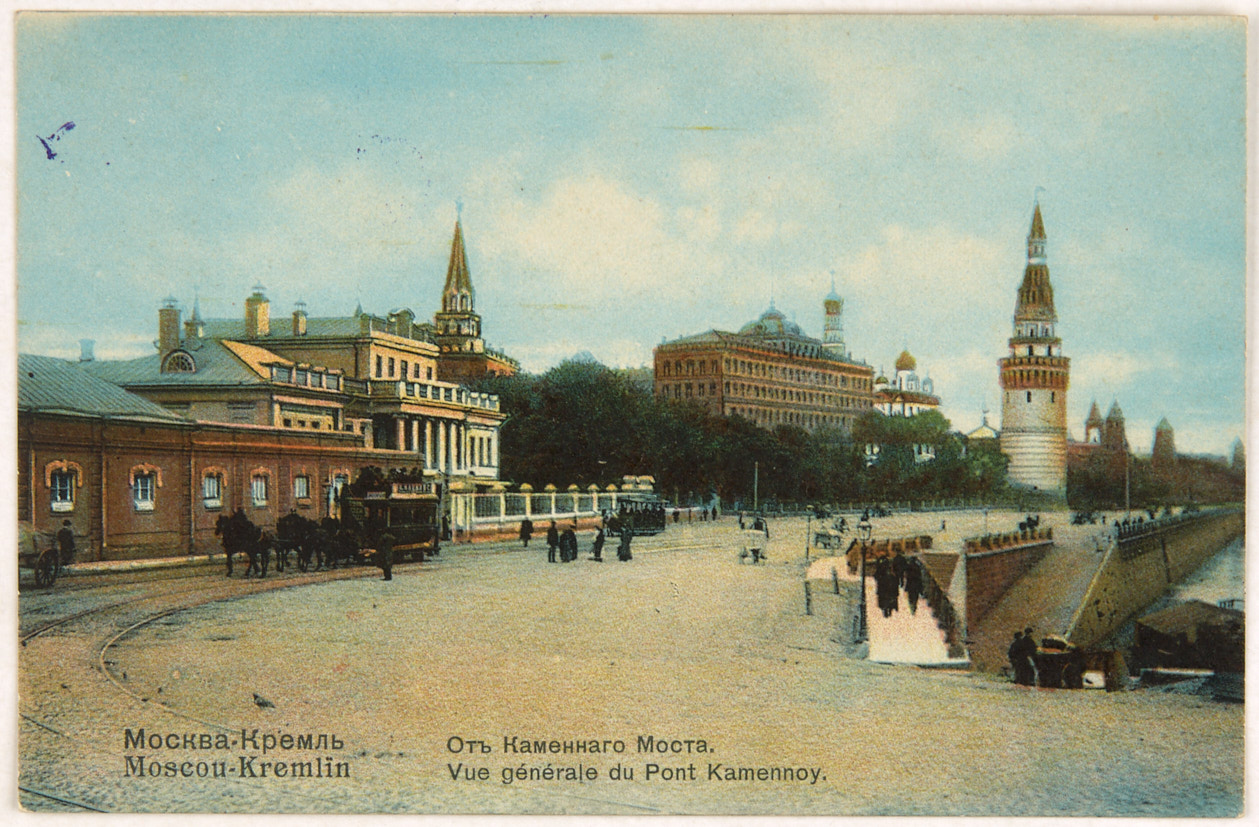Лот из двух цветных видов Москвы: вид колокольни Ивана Великого, вид на Кремль со стороны Каменного моста. Начало XX в. Всемирный почтовый союз. Издание П. фон Гиргенсон. Москва. 14×9 см.