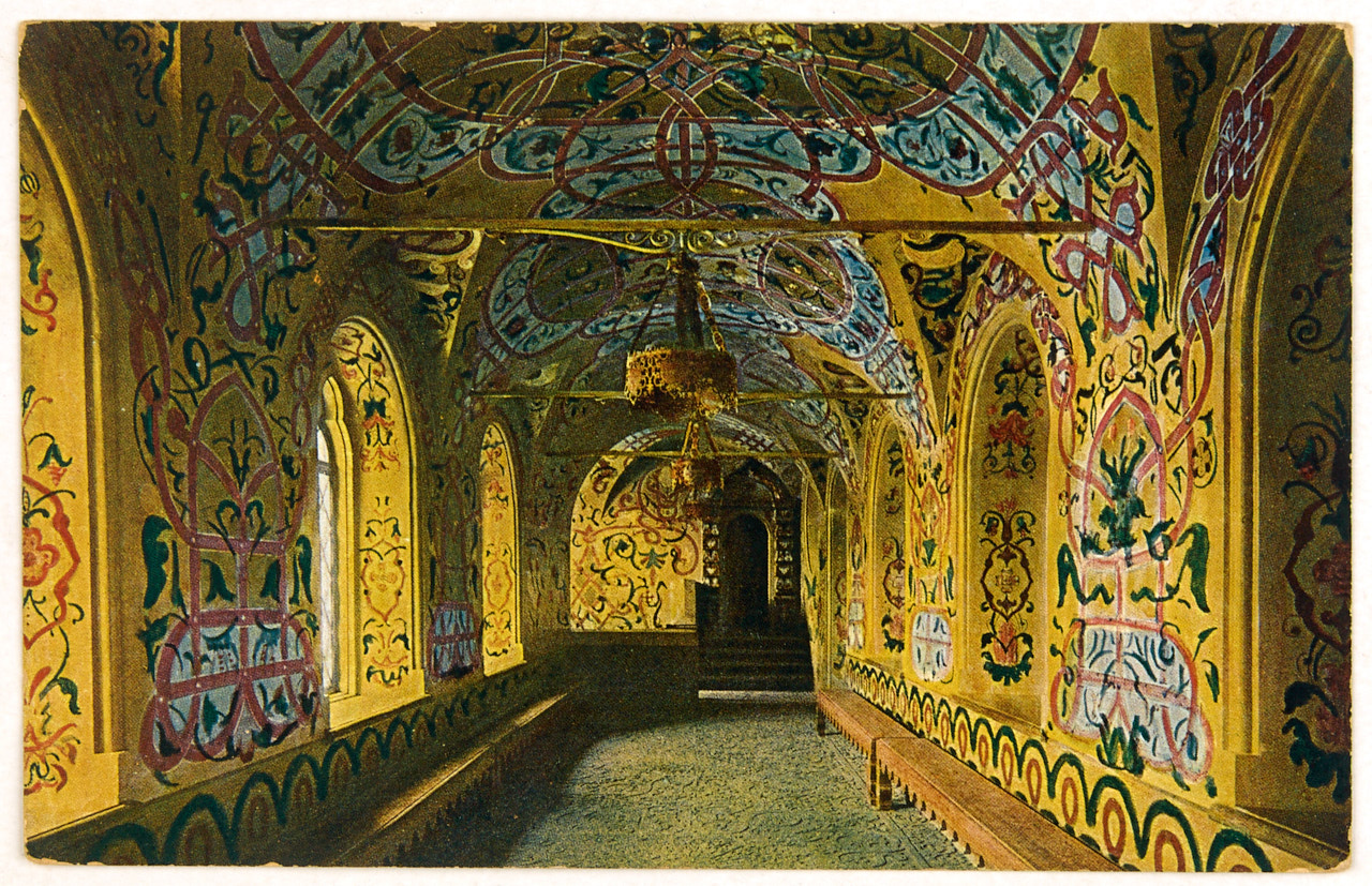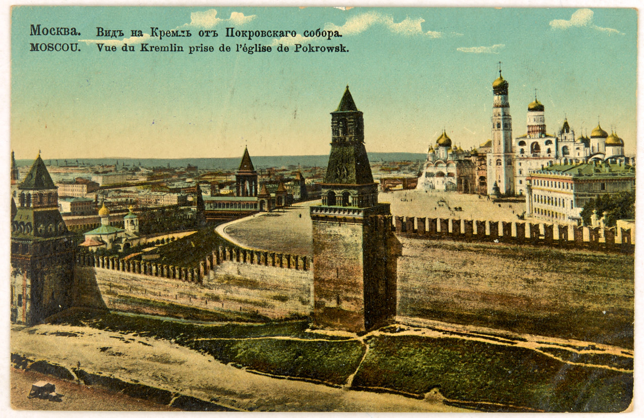 Лот из двух цветных видов Москвы: Вид Кремля от Покровского собора, коридор в Теремном дворце. Начало XX в. Всемирный почтовый союз. Издание И. Силина. Москва. 14×9 см.