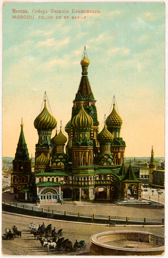 Лот из двух цветных видов Москвы: Собор Василия Блаженного, Красная площадь. Начало XX в. Всемирный почтовый союз. Издание И. Силина. Москва. 9×14;14×9 см.
