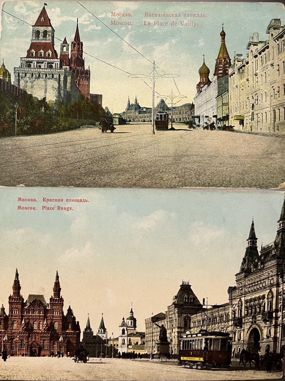 Лот из двух цветных видов Москвы: Красная площадь, Васильевская площадь. Начало XX в. Всемирный почтовый союз. Издание П. фон Гиргенсон. Москва. 14×9 см.