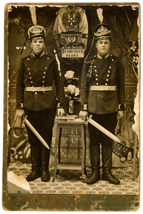Кабинет-портрет рядовых лейб-гвардии Волынского стрелкового полка на лобном месте в парадной форме. Петроград. 1910-е гг. Фотография, 15,2×10,5 см.