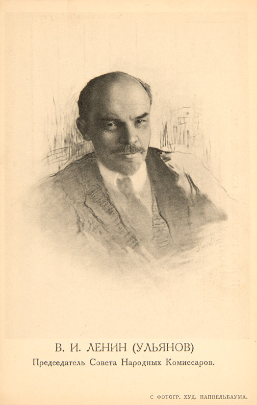 Портрет В. И. Ленина-Ульянова, председателя Совета народных комиссаров. С фотографии Наппельбаума. Всемирный Почтовый союз. Россия. 1918 г. 14×9 см.