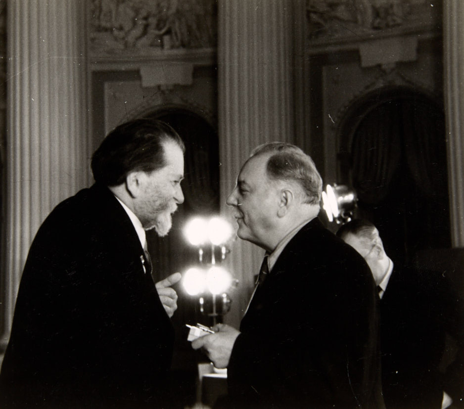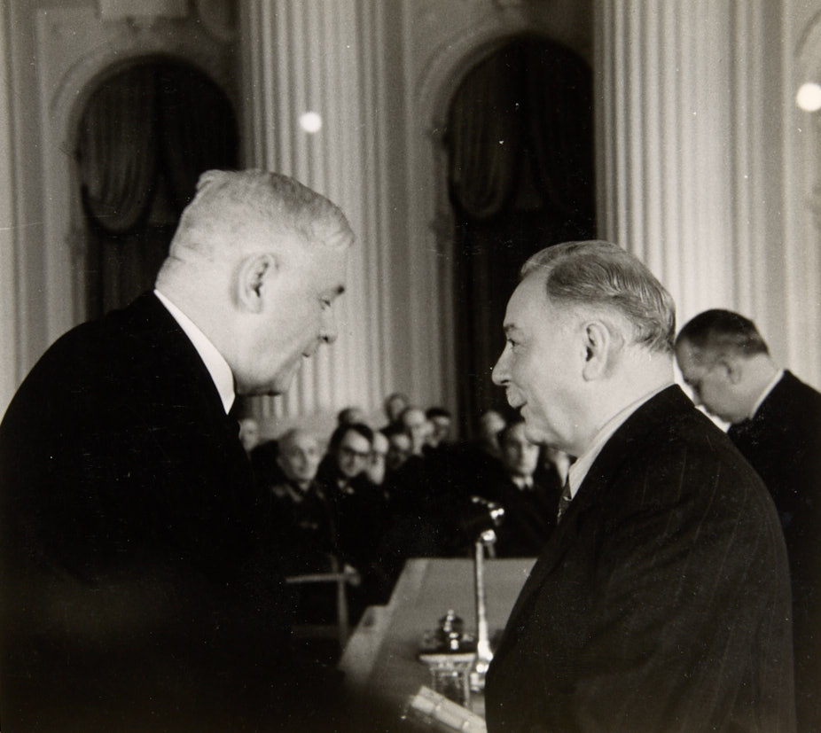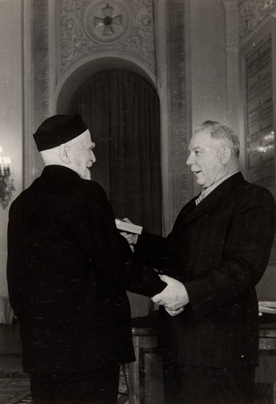 Лот из 3 фотографий. Председатель президиума Верховного совета СССР К. Е Ворошилов вручает государственные награды в Георгиевском зале Московского Кремля. 1950-е гг. Фотографии, 22,5×15; 16,5×17,9; 15,5×17,5 см.