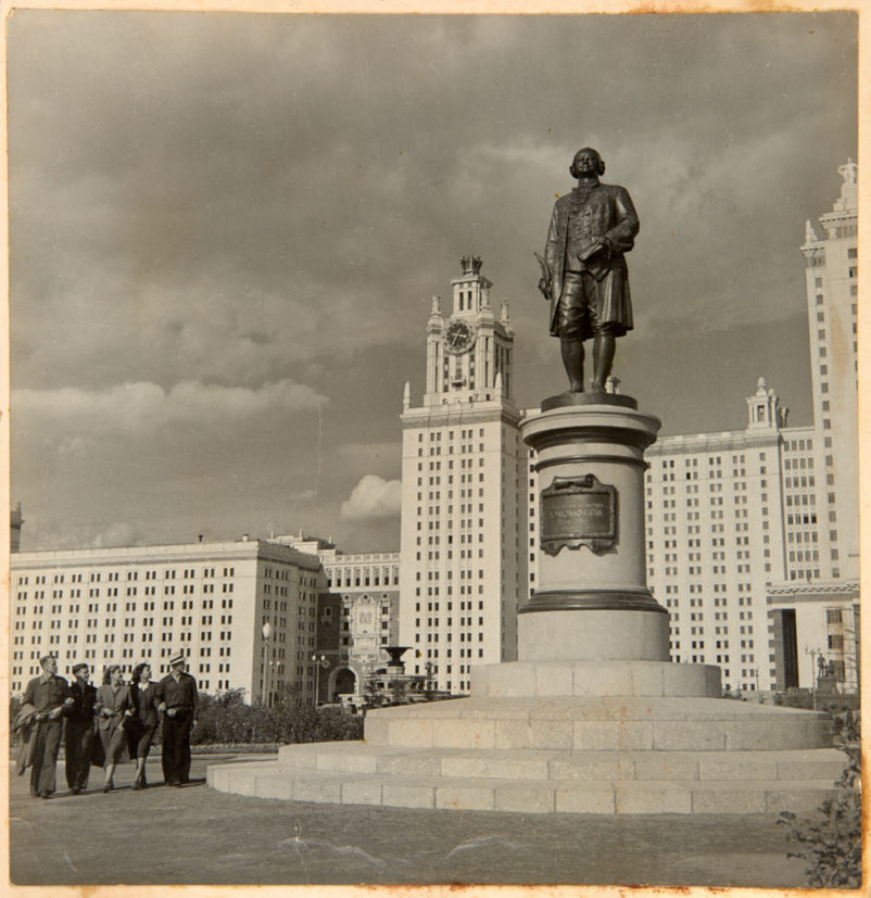 Группа студентов у здания МГУ на Ленинских горах. Середина 1950-х гг. Фотография, 19×18,3 см.