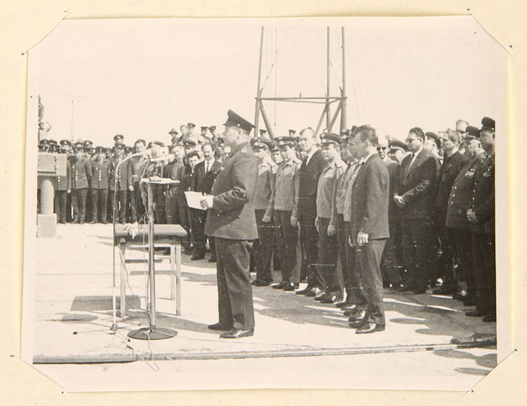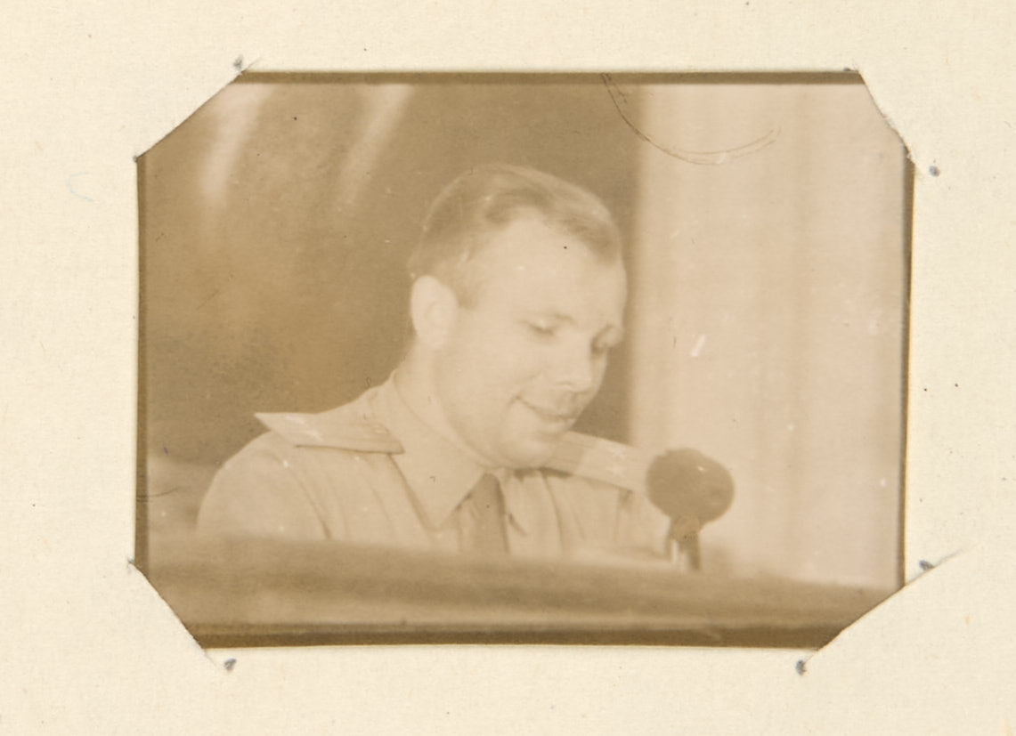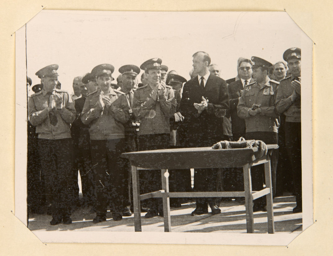 Лот из 4 фотографий, связанных с историей космонавтики. Байконур. Митинг перед стартом. Ю. А. Гагарин, Н. П. Каманин и космонавты. Интервью Гагарина перед полетом. Начало 1960-х гг. 8×11,3; 9×11,6; 9×11,8; 3,2×4,5 см.