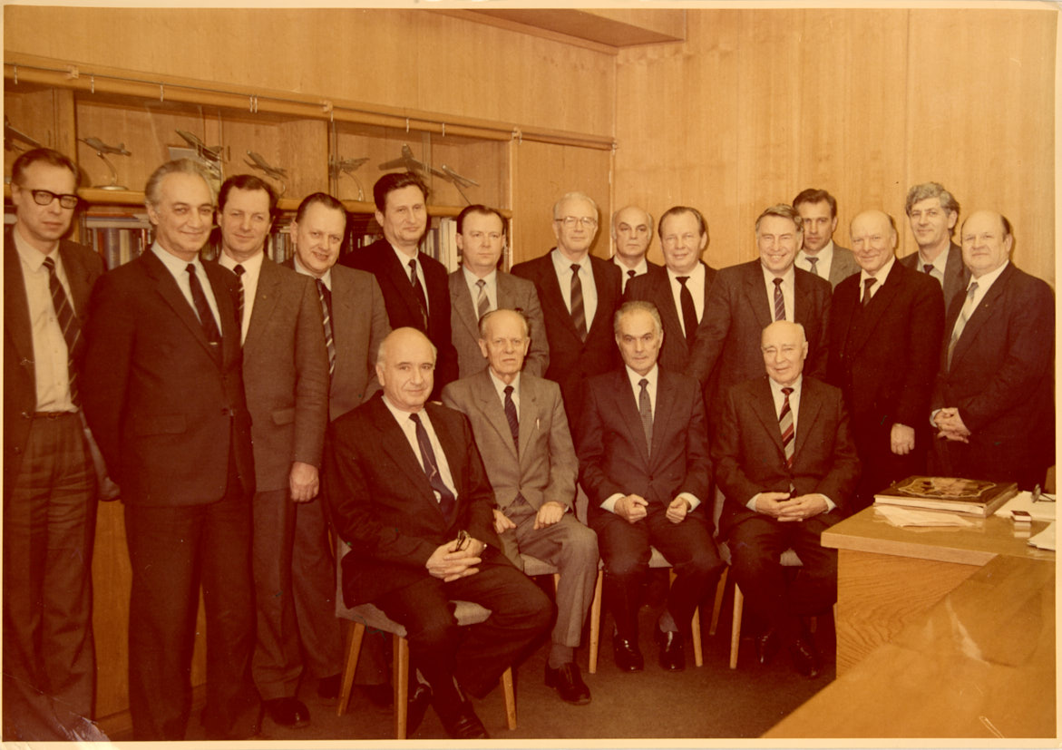 Групповой портрет авиаконструкторов бюро А. И. Микояна (создатели истребителя МиГ). Сидят: Вальденбург, Седов, Беляков, Матюк. Стоят: Крайнов, Микоян, Баранов, Степанов, Воротников, Кострубекий, Шенгелия, Королев, Янышев, Белосвет, Меницкий, Ушкинцев, Слободской, Кокушкин. 1970-е гг. Фотография, 20,5×29,2 см.