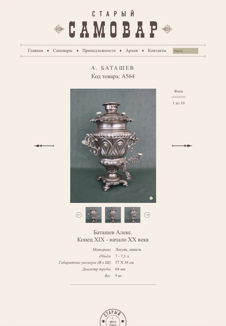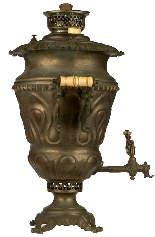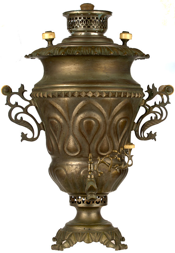 Самовар «Византийский тюльпан». Фабрика Баташова. Тула. 1860-1870-е гг. Латунь, чеканка, литье, слесарные работы, кость, 55×38×16×16 см.