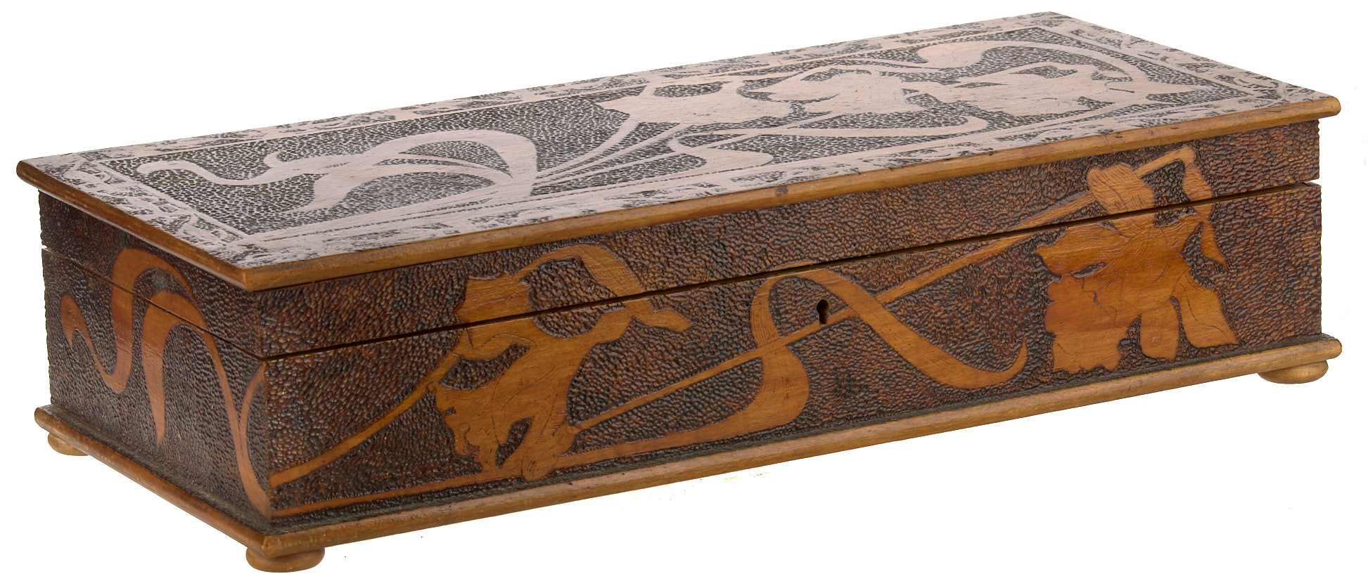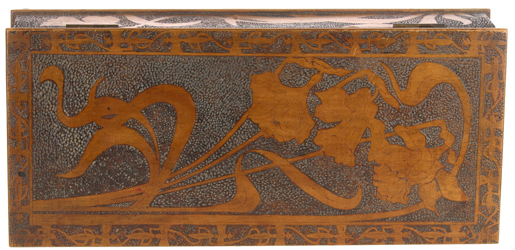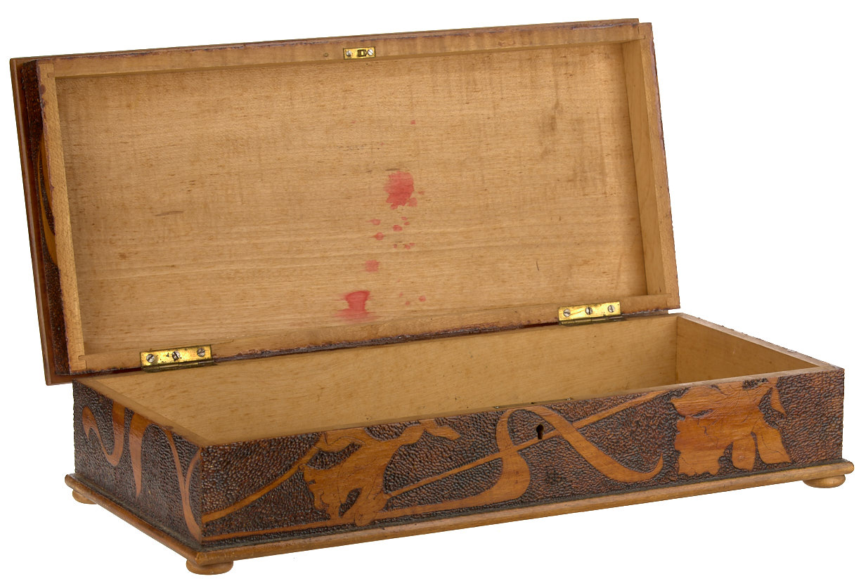Шкатулка с ирисами в стиле модерн. 1910-е гг. Дерево, резьба, 17,5×38×8,5 см. На обороте штамп магазина «Город Ницца на Арбате в Москве».