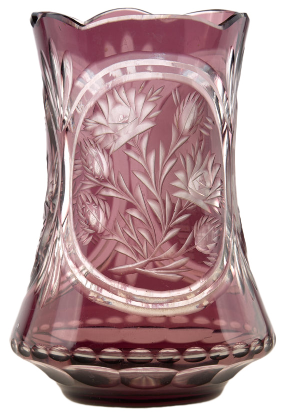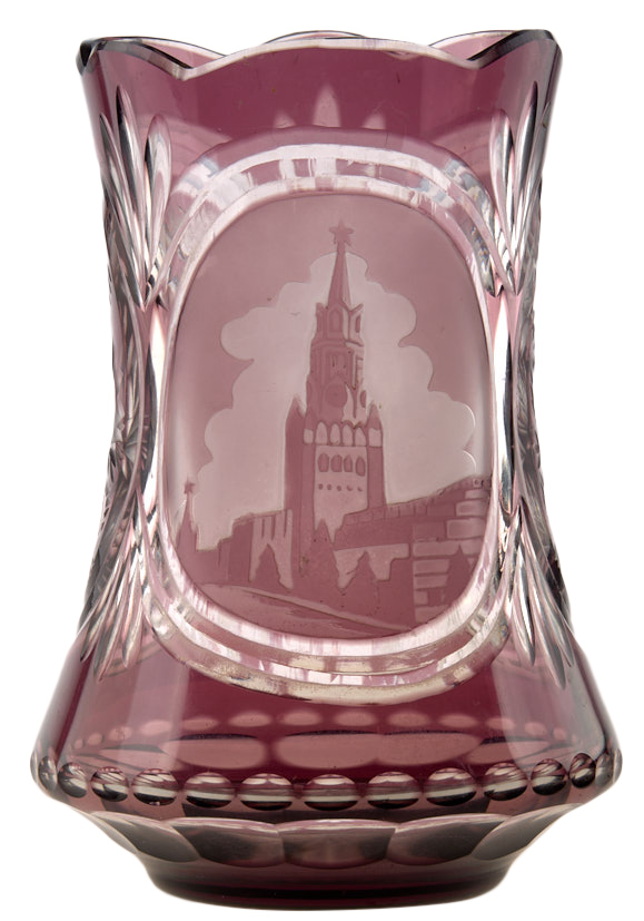 Ваза с изображением Кремля в картуше. Ленинградский завод художественного стекла. Вторая половина 1940-х гг. Двуцветное стекло с аметистовым нацветом, выдувание, гравировка, травление, 20×11×7,5 см.