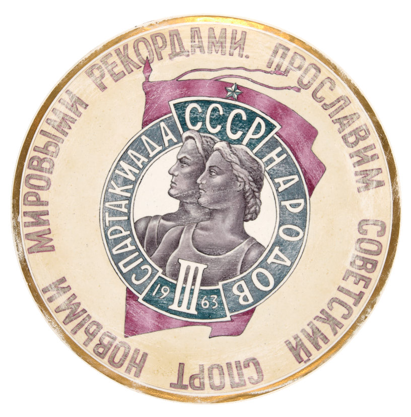 Тарелка агитационная. Новыми мировыми рекордами прославим советский спорт. Третья спартакиада народов СССР. 1963 г. Фарфор, роспись, золочение, 24,3 см.