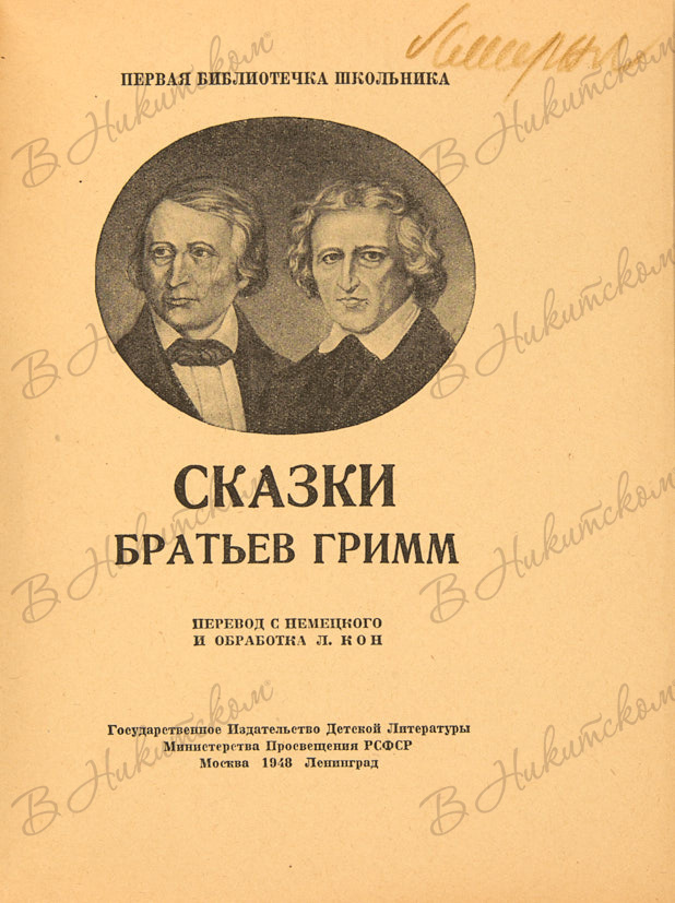 [Серия «Первая библиотечка школьника»]. Сказки / перев. с нем. и обраб. Л. Кон. М.; Л.: ДЕТГИЗ, 1948.
