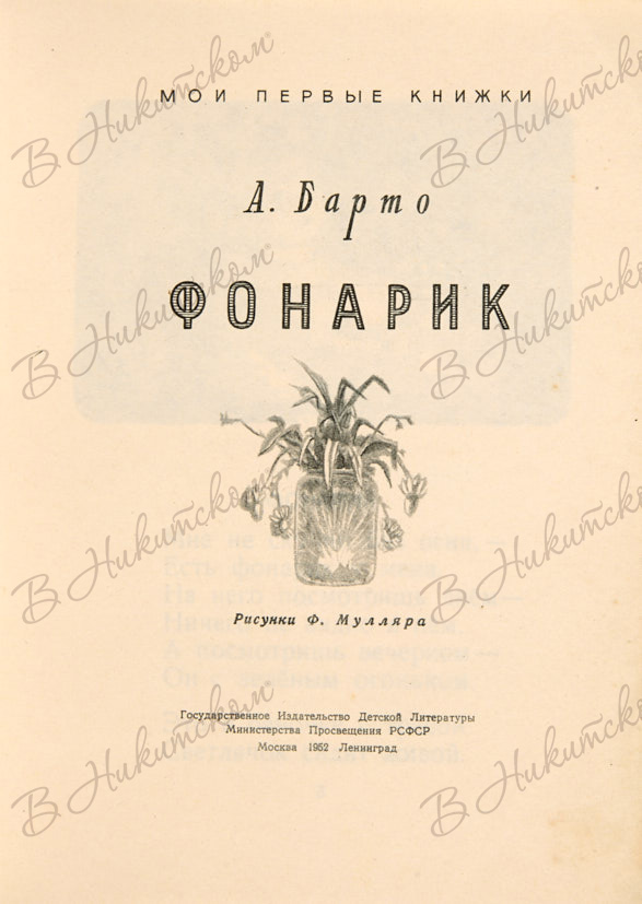 [Серия «Мои первые книжки»]. Барто, А. Фонарик / рис. Ф. Мулляра. М.; Л.: ДЕТИЗДАТ, 1952.