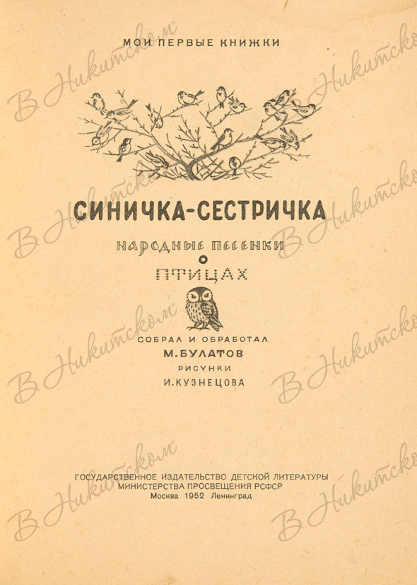 [Серия «Мои первые книжки»]. Синичка-сестричка / Собрал и обработал М. Булатов; рис. И. Кузнецова. М.; Л.: ДЕТГИЗ, 1952.