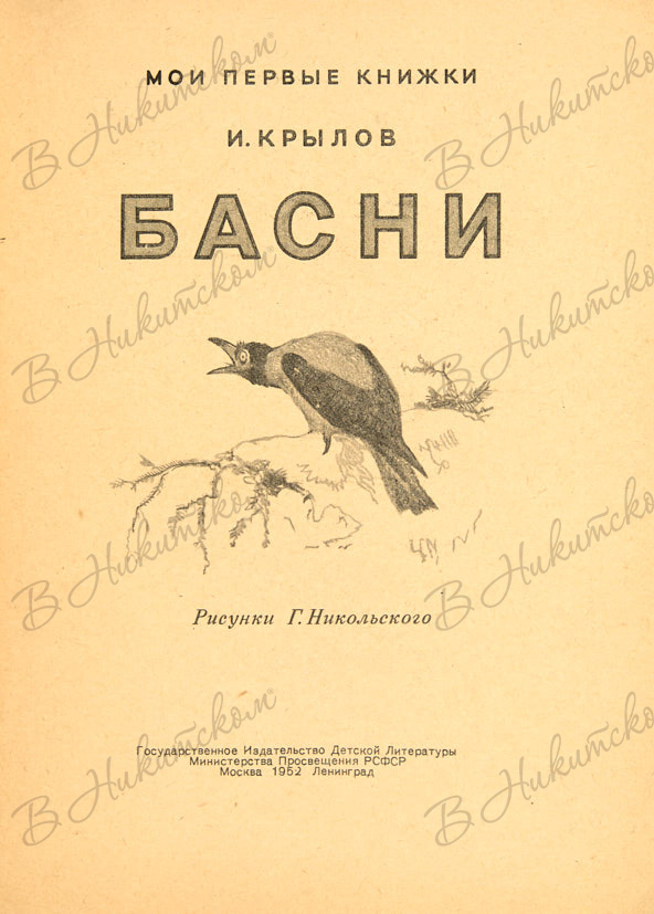 [Серия «Мои первые книжки»]. Крылов, И. Басни / рис. Г. Никольского. М.; Л.: ДЕТГИЗ, 1952.