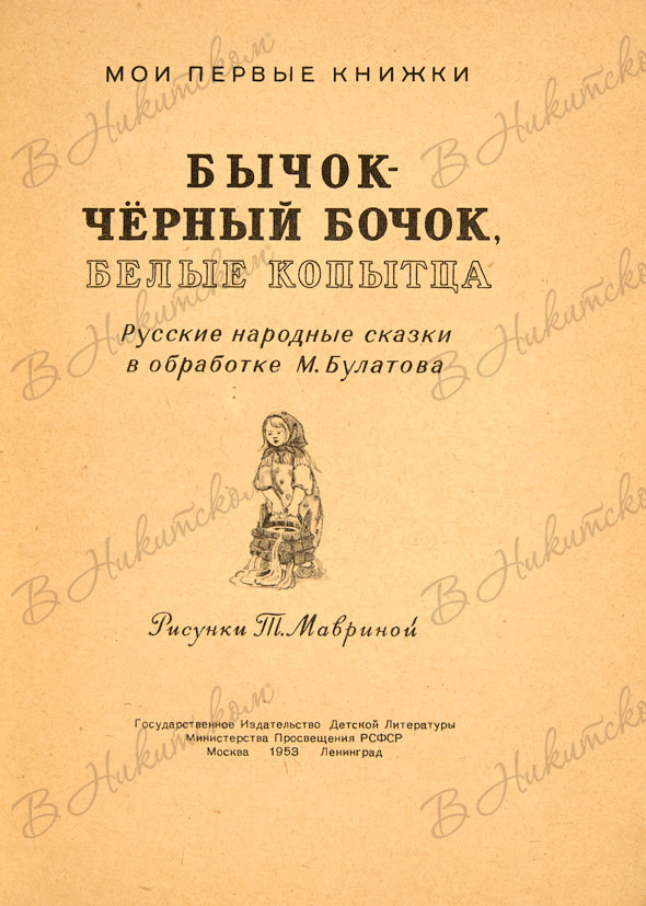[Серия «Мои первые книжки»]. Бычок – чёрный бочок, белые копытца. Русские народные сказки / обраб. М. Булатова; рис. Т. Мавриной. М.; Л.: ДЕТГИЗ, 1953.