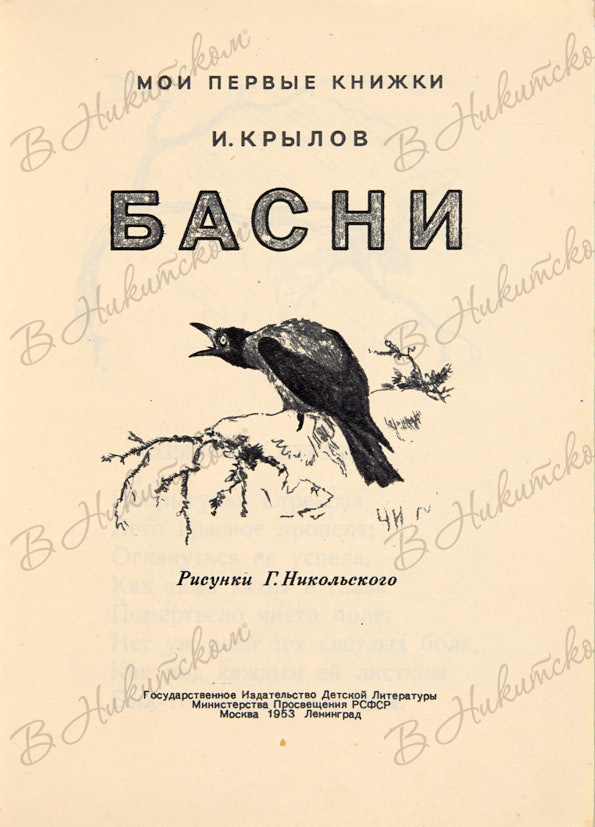 [Серия «Мои первые книжки»]. Крылов, И. Басни / рис. Г. Никольского. М.: ДЕТГИЗ, 1953.
