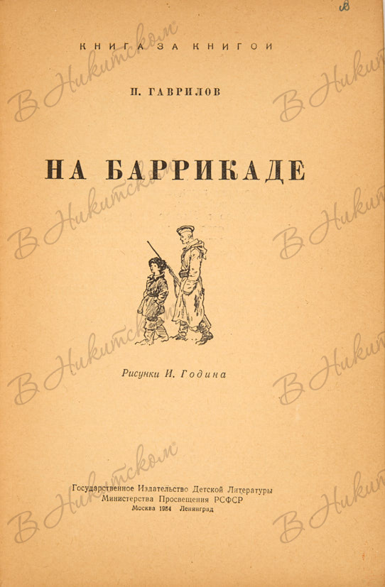 [Серия «Книга за книгой»]. Гаврилов, П. На баррикаде / рис. И. Година. М.; Л.: ДЕТГИЗ, 1954.