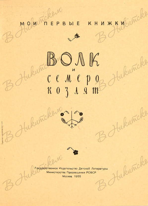 [Серия «Мои первые книжки»]. Волк и семеро козлят. Русская народная сказка / обработка М. Булатова; рис. М. Успенской. М.: ДЕТГИЗ, 1955.