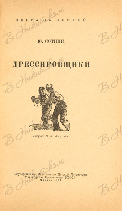 [Серия «Книга за книгой»]. Сотник, Ю. Дрессировщики / рис. В. Ладягина. М.: ДЕТГИЗ, 1955.