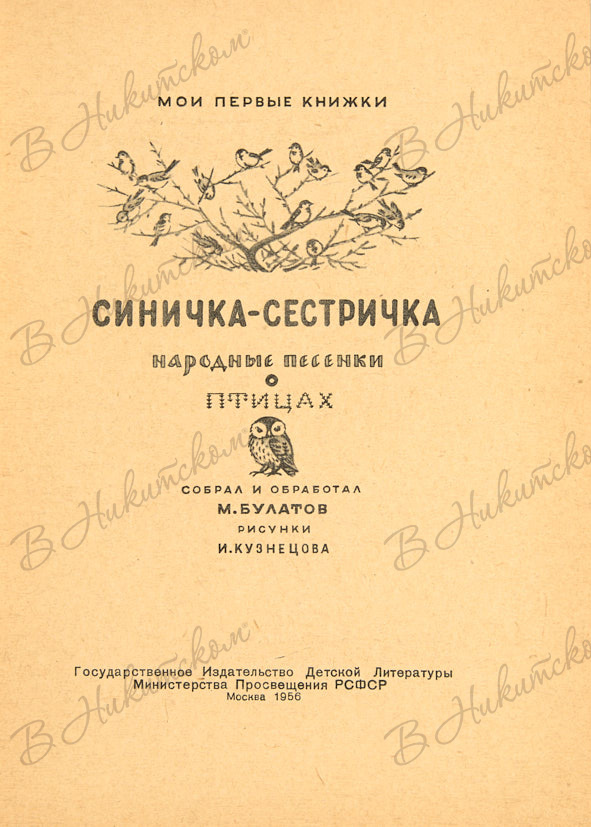 [Серия «Мои первые книжки»]. Синичка-сестричка / Собрал и обработал М. Булатов; рис. И. Кузнецова. М.: ДЕТГИЗ, 1956.
