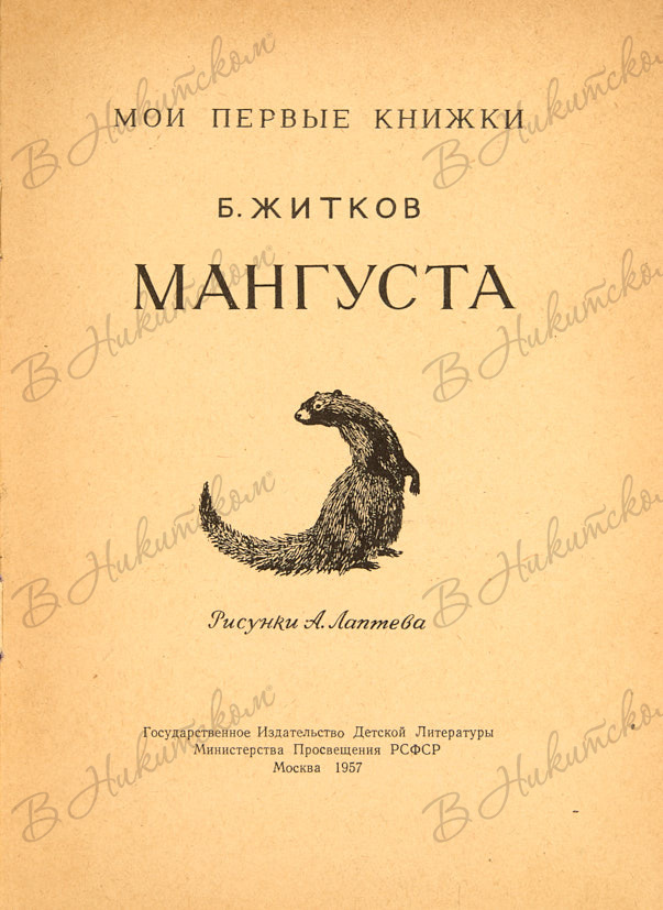 [Серия «Мои первые книжки»]. Житков, Б. Мангуста / рис. А. Лаптева. М.: ДЕТГИЗ, 1957.