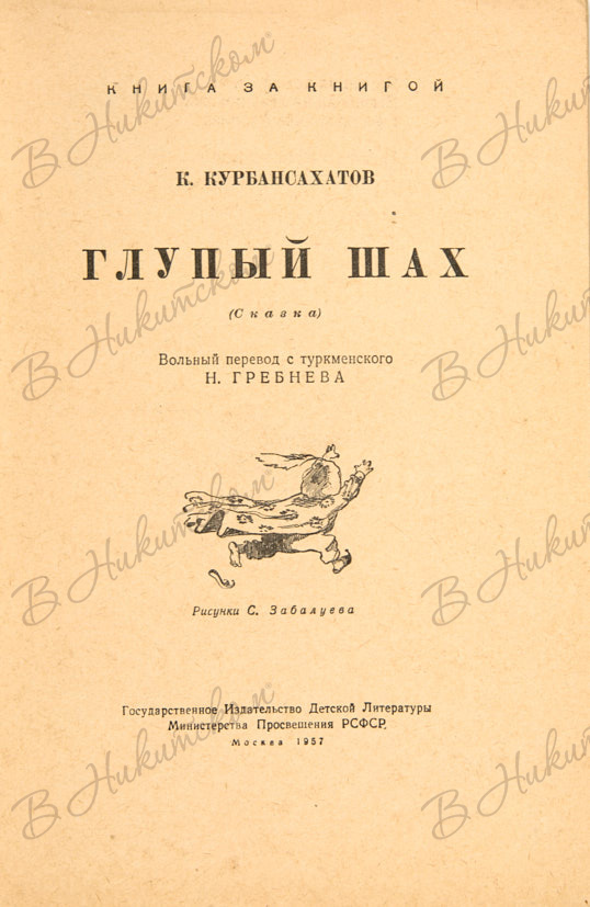 [Серия «Книга за книгой»]. Курбансахатов, К. Глупый шах. (Сказка) / Вольный перевод с туркменского Н. Гребнева; рис. Н. Забалуева. М.: ДЕТГИЗ, 1957.