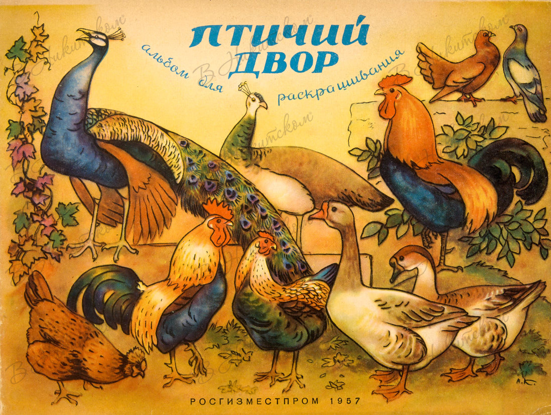 Птичий двор. Альбом для раскрашивания / худ. А. Комаров; худ. ред. Ю. Поливанов. М.: РОСГИЗМЕСТПРОМ, 1957.