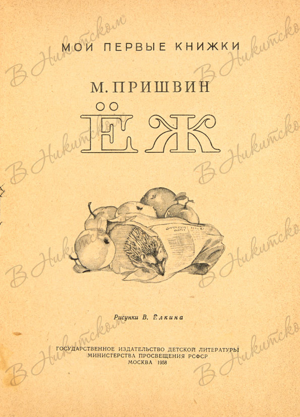 [Серия «Мои первые книжки»]. Пришвин, М. Ёж / рис. В. Ёлкина. М.: ДЕТГИЗ, 1958.
