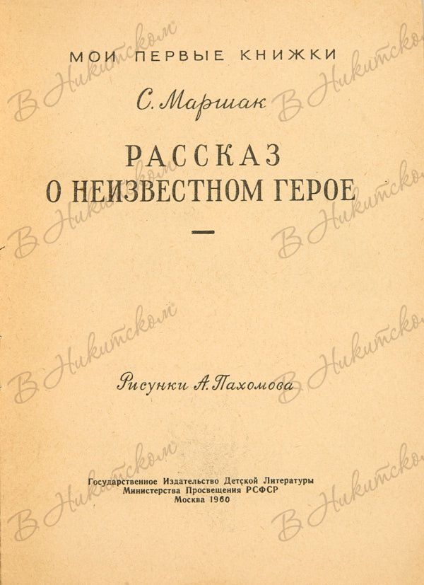 [Серия «Мои первые книжки»]. Маршак, С. Рассказ о неизвестном герое / рис. А. Пахомова. М.: ДЕТГИЗ, 1960.