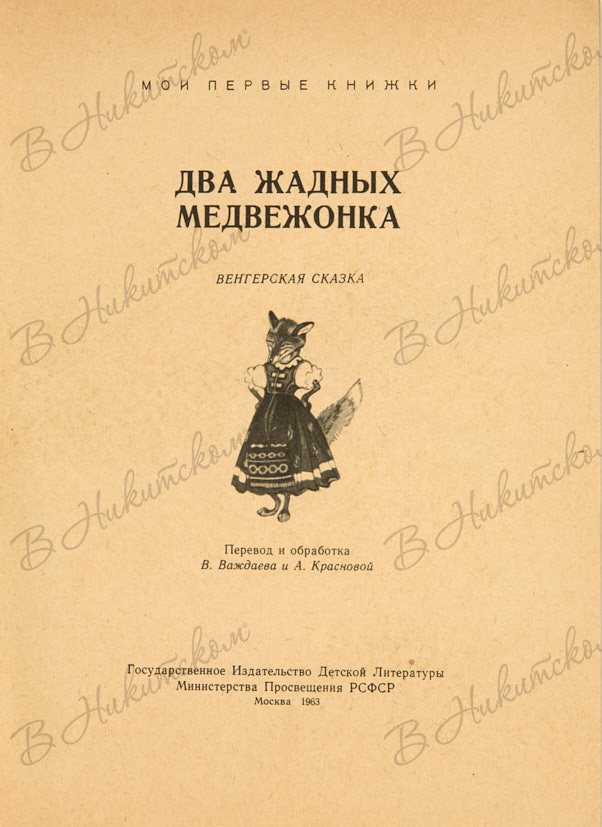 [Серия «Мои первые книжки»]. Два жадных медвежонка. Венгерская сказка / перевод и обработка В. Важдаева и А. Красновой; рис. Е. Рачёва. М.: ДЕТГИЗ, 1963.