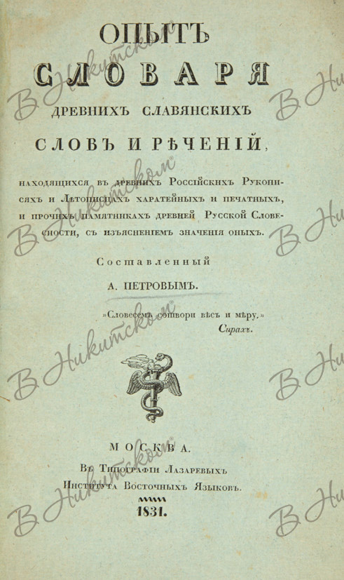 Петров, А. Опыт словаря древних славянских слов и речений, находящихся в древних российских рукописях и летописцах харатейных и печатных, и прочих памятниках древней русской словесности, с изъяснением значения оных. М.: В Тип. Лазаревых Института Восточных Языков, 1831.