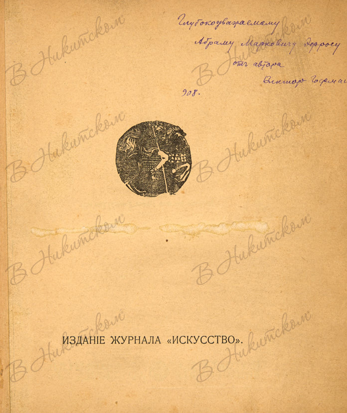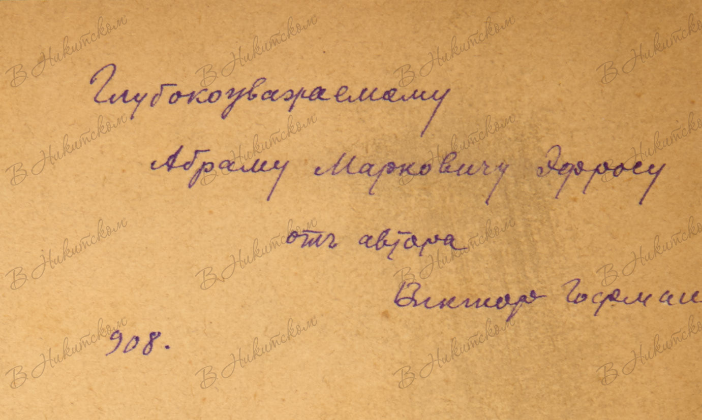 [4], 121, [7] с. 17,7 х 15,5 см. Во владельческом переплете эпохи, фрагменты издательской обложки наклеены на крышки. незначительные пятна на титуле, нет форзаца 2а. На титуле автограф автора: «Глубокоуважаемому / Абраму Марковичу Эфросу / от автора / Виктор Гофман / 908.».
