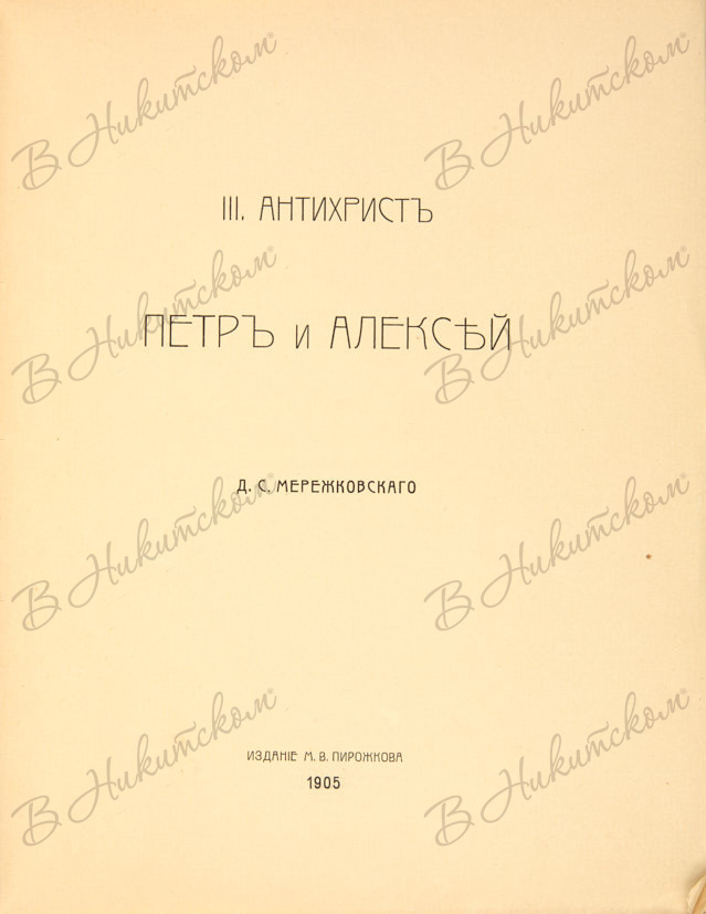 Мережковский, Д.С. Христос и Антихрист: трилогия. В 3 кн. Кн. 3. Антихрист. Петр и Алексей. СПб.: Издание М.В. Пирожкова, 1905.