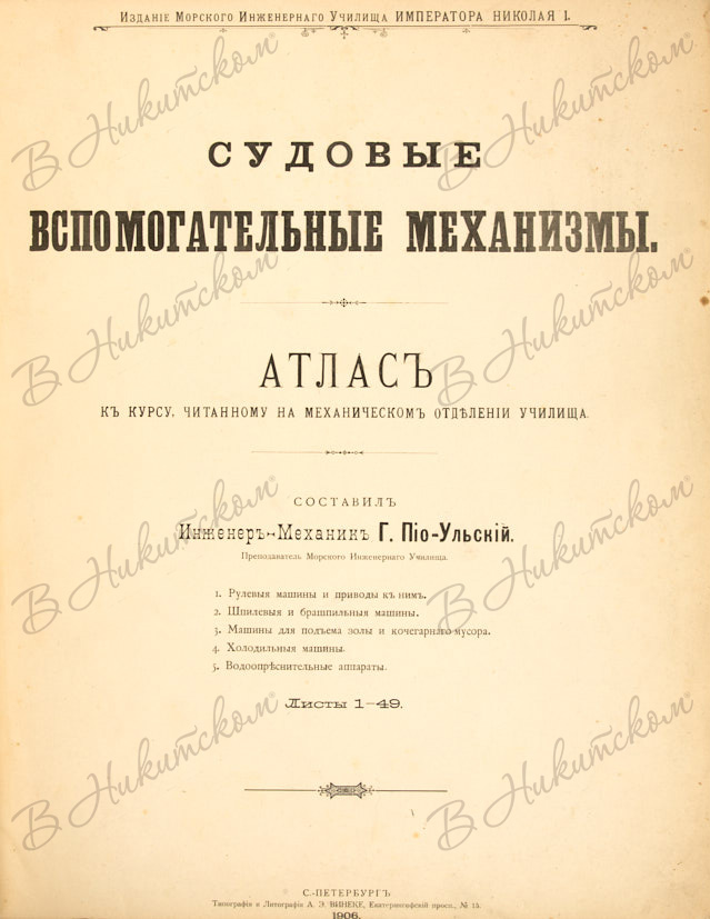 Пио-Ульский, Г. Судовые вспомогательные механизмы. Атлас к курсу, читанному на Механическом отделении училища. СПб.: Тип. А.Э. Винеке, 1906.