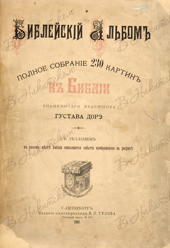 Доре, Г. Библейский альбом. Полное собрание 230 картин к Библии знаменитого художника Густава Дорэ. С указанием в каком месте Библии описывается событие изображенное на рисунке. СПб.: И.Л. Тузов, 1906.
