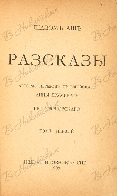 Аш, Ш. Рассказы / авториз. пер. с евр. А. Брумберг и Е. Тропковского. [В 3 т.]. Т. 1. СПб.: Изд. «Шиповник», 1908.