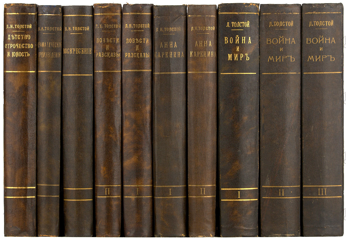 28,7 х 21 см. В десяти издательских переплетах с золотым тиснением по корешкам и передним крышкам. Часть томов из подарочного варианта издания с металлическими накладками: «Война и мир» - первый том, «Анна Каренина» - первый том, «Повести и рассказы» - оба тома, «Драматические произведения». Незначительные потертости переплетов, бумажный экслибрис на форзаце 1б в каждом томе. «Повести и рассказы» - утрата одной кальки в т. 1, владельческий штамп на титуле т. 2, утрата одной кальки.
