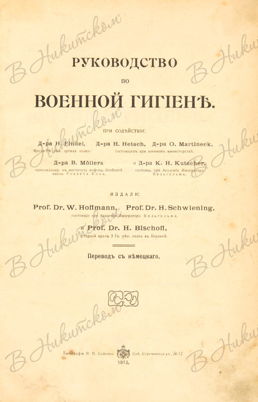 Бишофф, Г., Швининг, Г., Хофман, В. Руководство по военной гигиене / пер. с нем. под ред. И.Ф. Рапчевского. Т. 4. Инфекционные и неинфекционные войсковые болезни. СПб.: Тип. П.П. Сойкина, 1913.