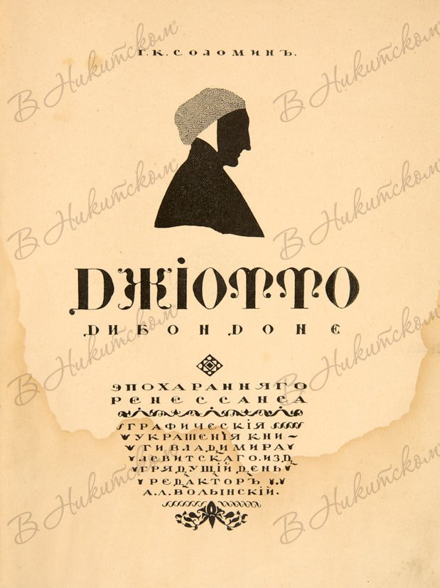 Соломин, Г.К. Джиотто ди Бондоне. Эпоха раннего Ренессанса / графические украшения книги Владимира Левицкого; редактор А.Л. Волынский. СПб.: Грядущий день, [1914].