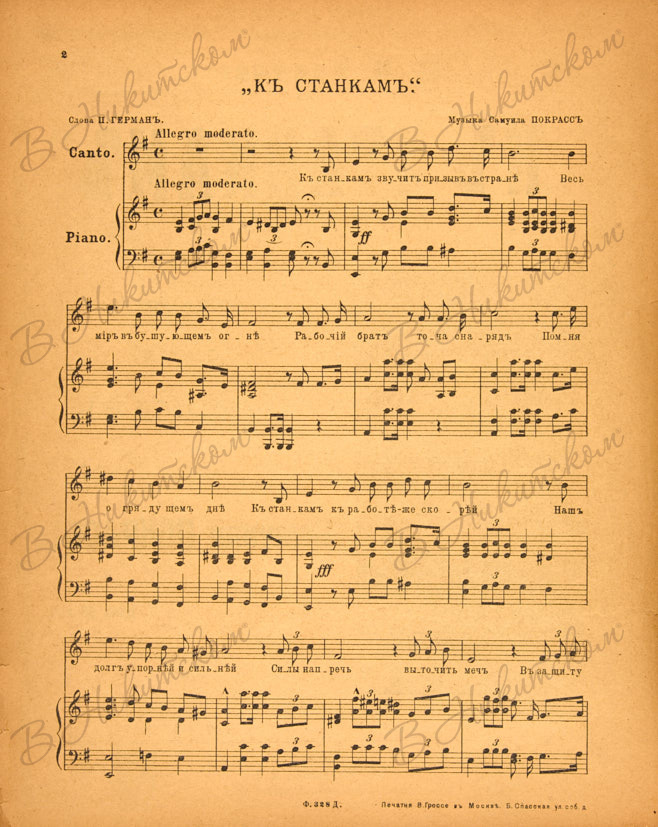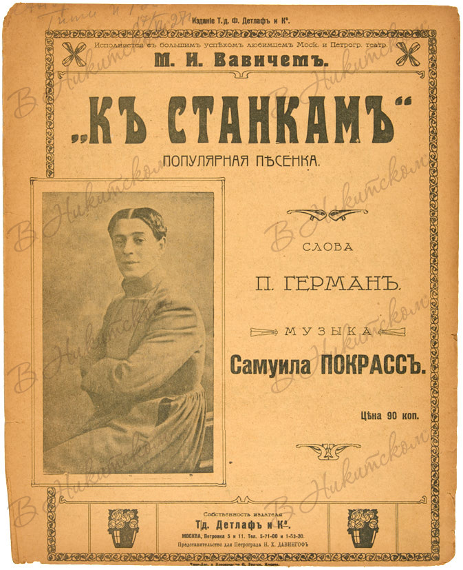 [Ноты]. К станкам. Популярная песенка. Слова П. Герман. Музыка Самуила Покрасс. М.: Т/д Детлаф и Ко, б.г.