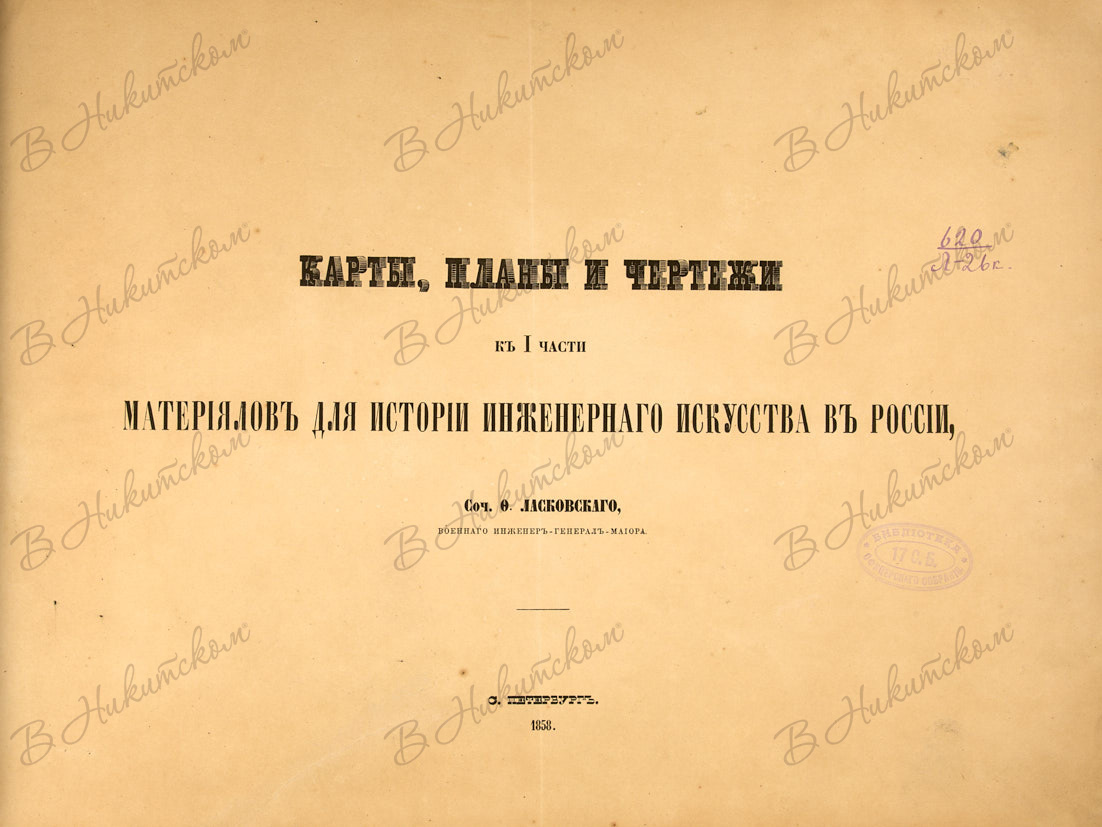 Ласковский, Ф. Карты, планы и чертежи к I части «Материалов для истории инженерного искусства в России». СПб., 1858.
