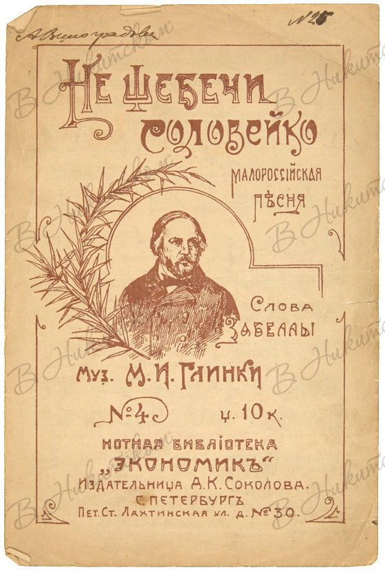 [Ноты]. Не щебечи, соловейко. Малороссийская песня. Слова Забеллы. Муз. М.И. Глинки. СПб.: А.К. Соколова, б.г.