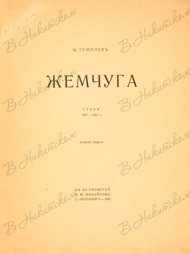 Гумилев, Н.С. Жемчуга. Стихи 1907-1910 г. 2-е изд. СПб.: Книгоиздательство «Прометей» Н.Н. Михайлова, 1918.