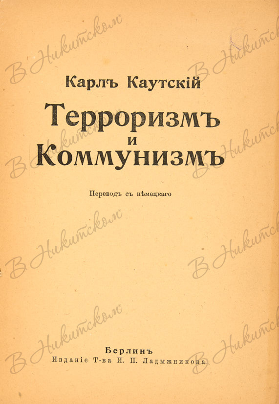Каутский, К. Терроризм и коммунизм. Берлин: Издание Т-ва И.П. Ладыжникова, [1919].