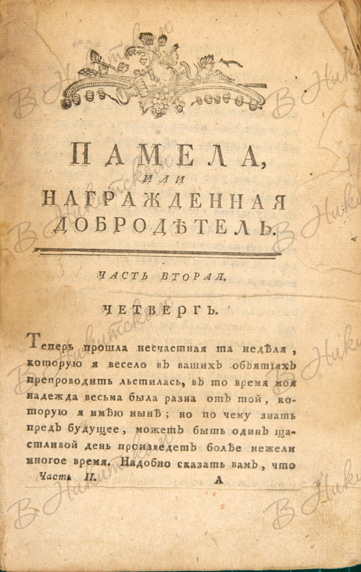 Ричардсон, С. Памела, или Награжденная добродетель. Аглинская нравоучительная повесть / пер. с фр. языка [П.П. Чертковым]. В 4 ч. Ч. 1-2. СПб., 1787.
