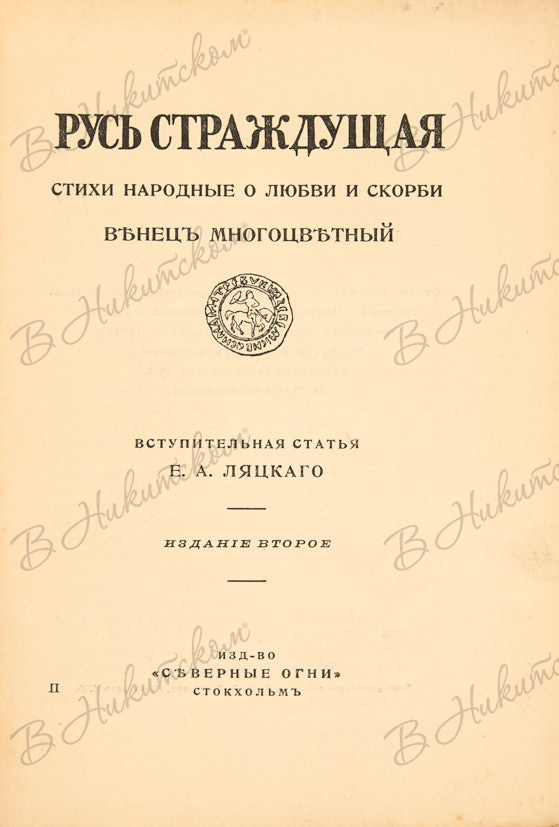 Русь страждущая. Венец многоцветный. Стихи народные о любви и скорби / сост. Е.А. Ляцкий, при участии Н. Платоновой, виньетки О. Белобородовой взяты из первого издания (Пг.: Огни, 1916 г). 2-е изд. Стокгольм: Северные огни, 1920.