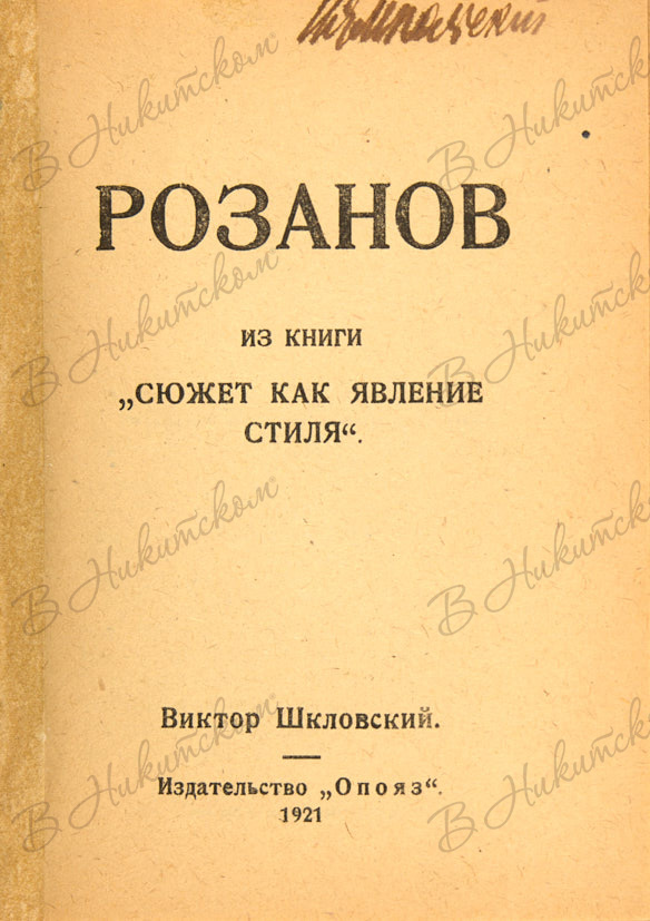 Шкловский, В. Розанов. Из книги «Сюжет как явление стиля». Пг.: Издательство «Опояз»; 9-я Гос. Типография, 1921.