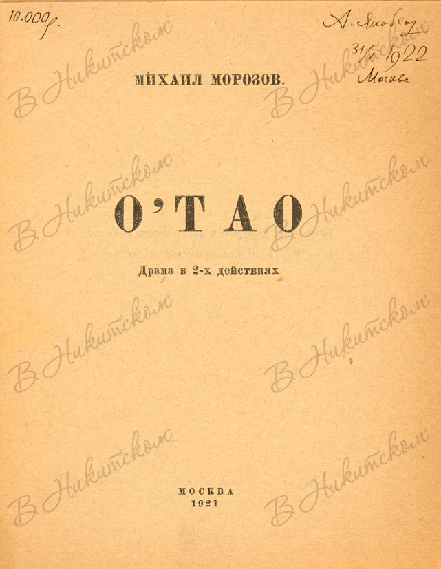 Морозов, М. О' Тао. Драма в двух действиях. М.: 16-я тип. М.С.Н.Х., 1921.