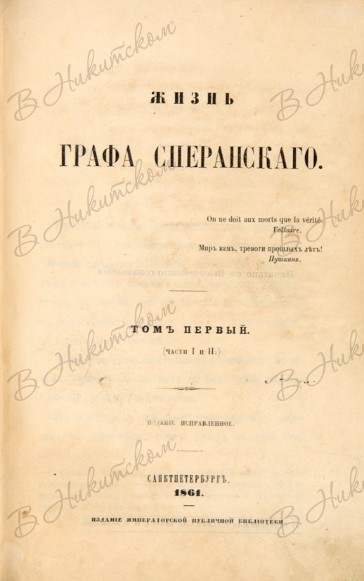 Корф, М.А. Жизнь графа Сперанского. [В 2 т.] Т. 1. СПб.: Изд. Императорской публичной библиотеки, 1861.